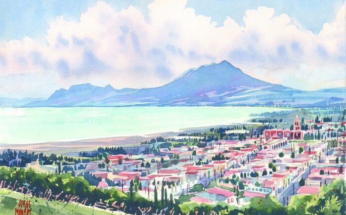A través de la acuarela, la muestra propone un recorrido por la ribera de Chapala y otros paisajes de Jalisco, en los que se exploran elementos como la luz, la atmósfera y la quietud del entorno.